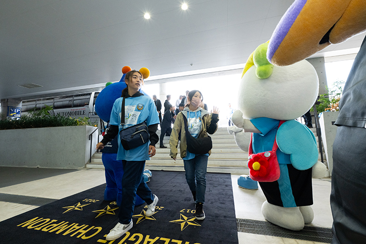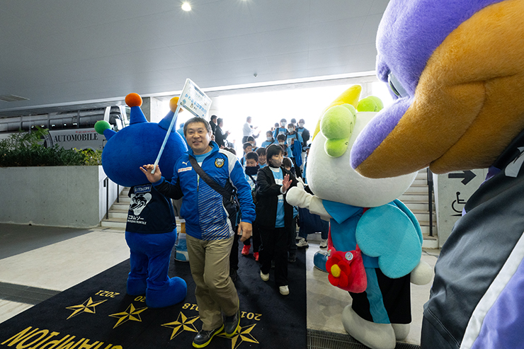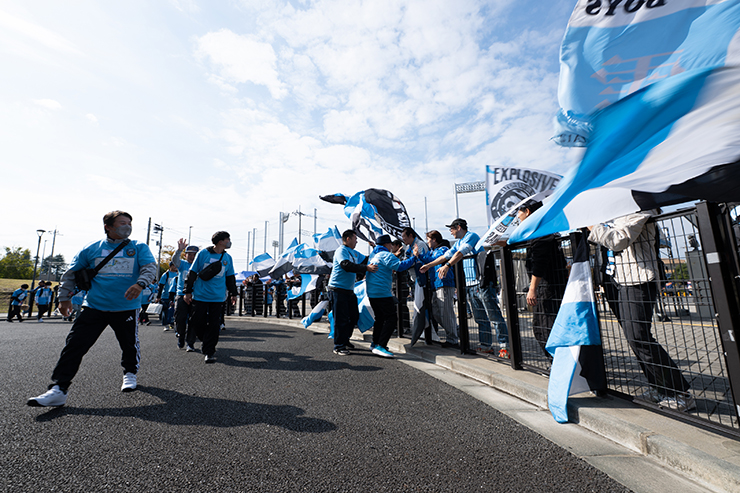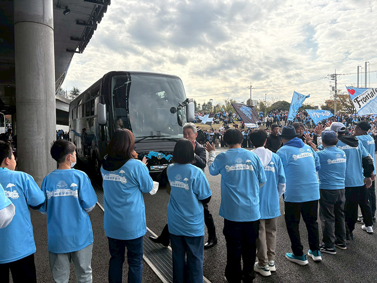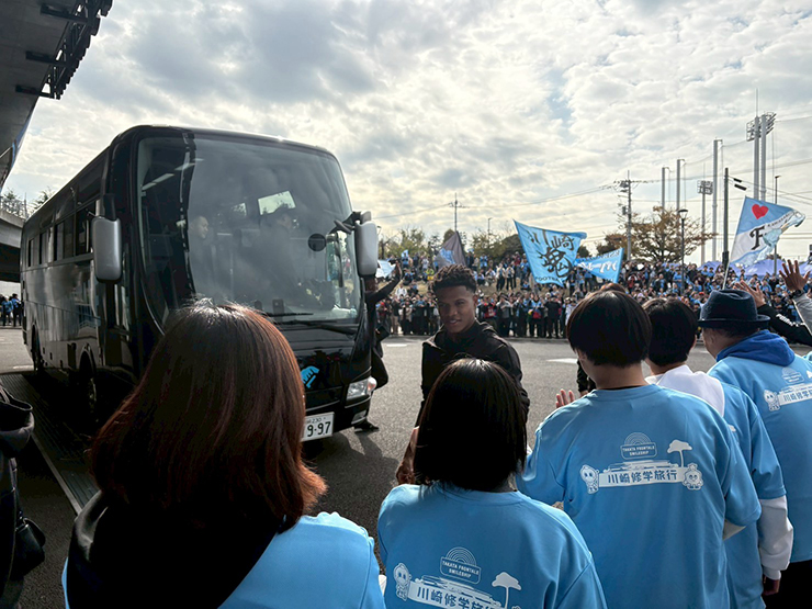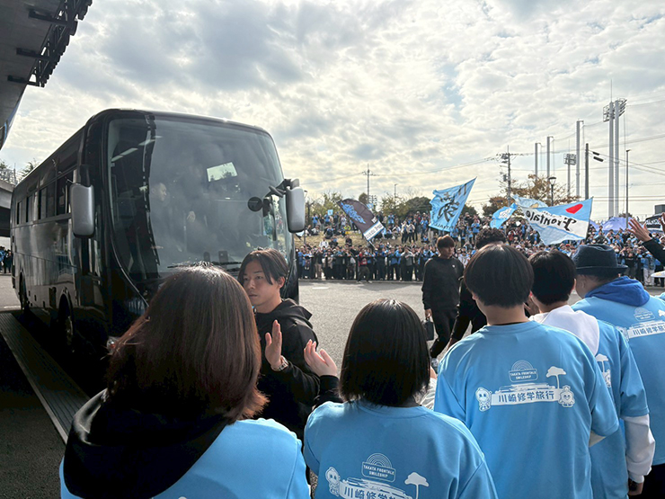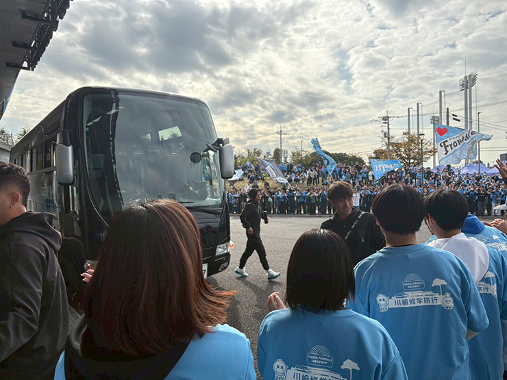 東京駅到着後はバスに乗り、この日岡山戦がある「Uvanceとどろきスタジアム by Fujitsu」に向けて出発。1時間かけてU等々力に到着してバスを降りると、サポーターの皆さんがバス待ちエリアのところで出迎えていただきました!!