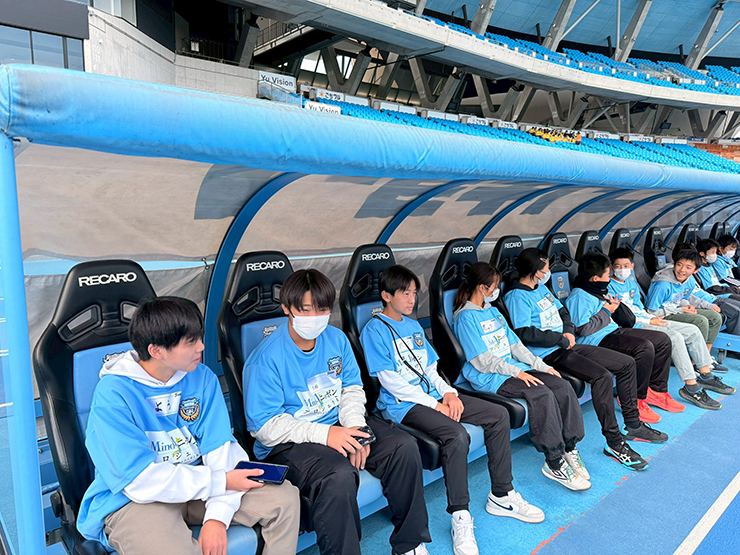 そして到着後すぐに、キックオフ前に行われる合同写真撮影のリハーサルが行われ、皆さんピッチレベルに入ると少し緊張した様子でしたがスムーズにリハーサルを行うことができました。リハーサルを終えると、実際に選手が座っているベンチに座って写真撮影をして皆さん大興奮! その後、フロンパークに移動をして自由時間。キッチンカーでお昼ごはんを購入したり、当日開催された「ボーイズビーアンビシャス」のブースを体験したりとフロンパークで楽しい時間を過ごしました!!