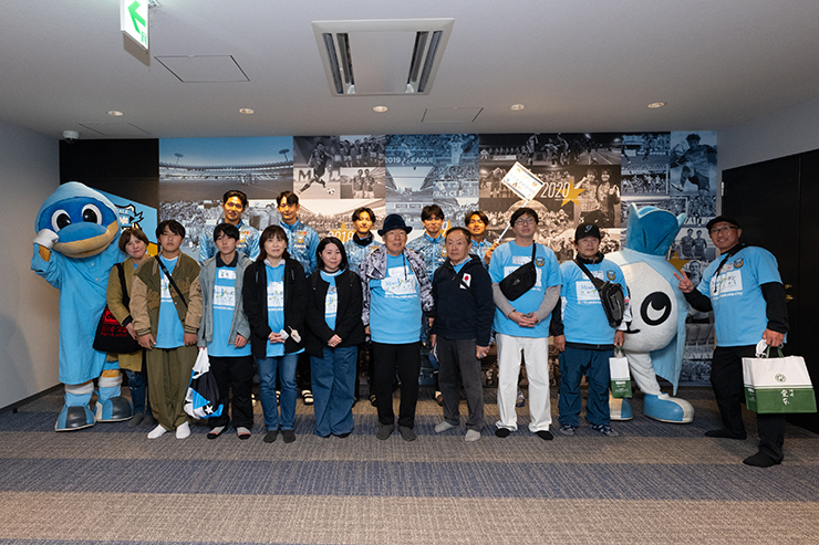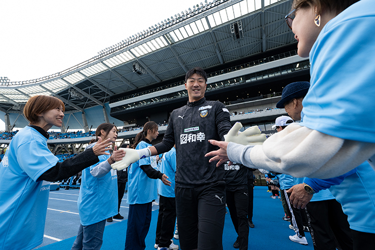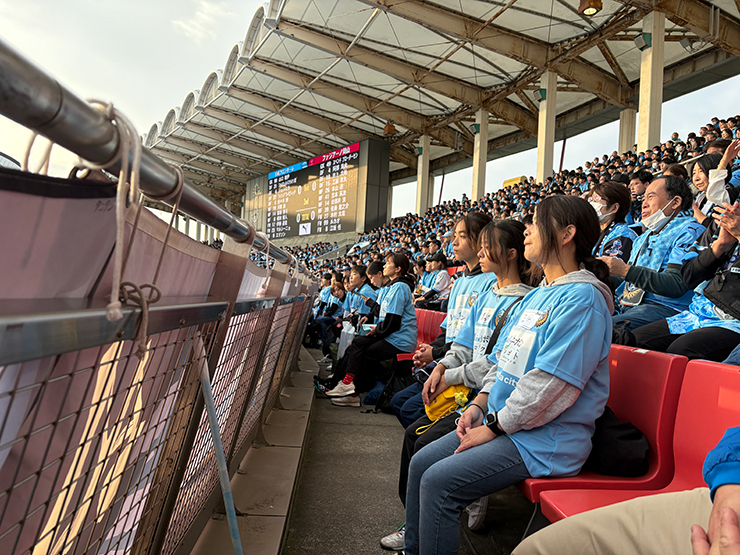 挨拶を終えて、いよいよ後半がキックオフ! 後半はさらに相手ゴールに迫る回数も増え、惜しいチャンスが続いていく中、自然と応援のボリュームも上がりスタジアム全体がとてもいい雰囲気になってきました。すると山本選手のシュートがゴールに突き刺さり見事先制!! 参加者の皆さんは喜んでみんなとハイタッチ! このまま試合終了かと思われましたが、終了間際に同点ゴールを許してしまい、1-1の同点で試合終了。