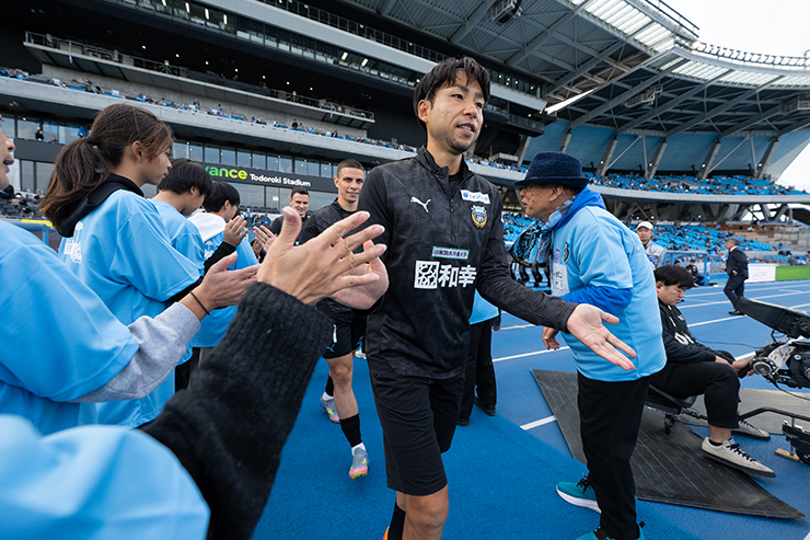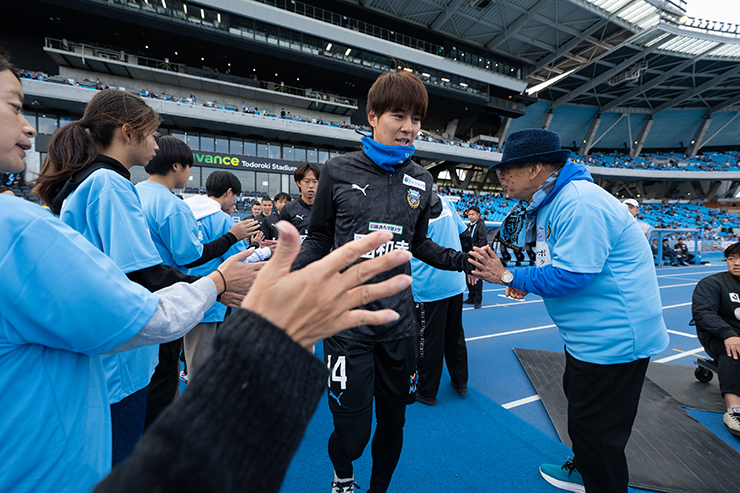 そして、自由時間の後はいよいよ選手バスのお出迎え! 選手を乗せたバスがU等々力に到着すると、サポーターによるチャントが始まります。大声援のチャントを聞いた皆さんも「鳥肌がやばい!」と一緒に手拍子をしながらバスをお出迎え。そこから監督・選手・コーチがバスから降りてきて皆さんとハイタッチをしました!