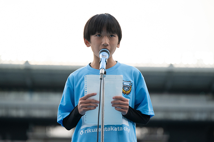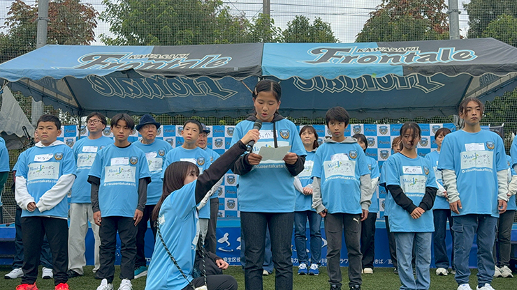 ハーフタイムには、ピッチレベルに移動しバッグスタンド側で「かわさき修学旅行」の挨拶を行いました。挨拶は参加者を代表し「タロウ」くんが挨拶を行いました。約2万人の観客の前での挨拶はとても緊張しておりましたが、堂々とした挨拶で、スタジアムにいる皆さんへ必ず思いは届いたかなと思います!!