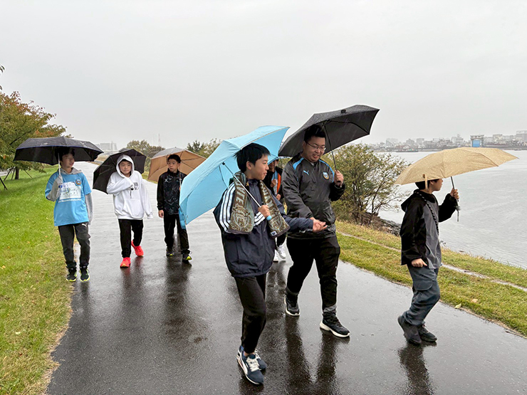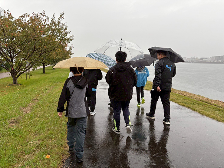 気温も低く寒い中、多摩川の土手沿いを歩いていくと羽田空港を見ることができました。さらに歩いていこうとすると、雨が強くなりホテルに引き返すことになりました。短い時間でしたが参加者の皆さんとコミュニケーションを取れるとてもいい時間となりました。ホテルに戻り、朝食を食べていよいよ2日目の出発の準備です!