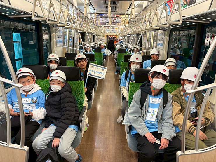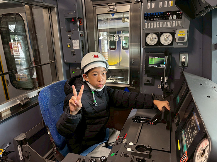その後車内に移動し、普段立ち入ることができない運転席に座って記念撮影!! みんな「出発進行!」とすっかり車掌さん気分に! 運転席での撮影を終えると、優良座席指定サービス「Q SEAT」についての説明を聞いた後に実際に、座席が回転する瞬間を見学することができました。そしてそのまま「Q SEAT」に座ったまま車両の洗車を見学し、大きな洗車機の中に車両が入るとみんなから「おお!」という声が聞こえてきましたよ。