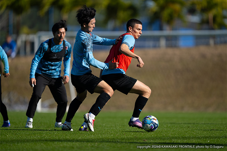 和やかな雰囲気でセレモニーを終えトレーニングがスタート。連動した動きを加えたパス&コントロールや実戦に近い対人形式で汗を流し、質高くトレーニングに取り組んでいました。沖縄キャンプは始まったばかりですが、すでに新加入選手も溶け込んでいる様子。さらに互いの理解を深め、特徴を引き出し合えるような関係性が築き上がっていく、と考えれば考えるほど楽しみですね。