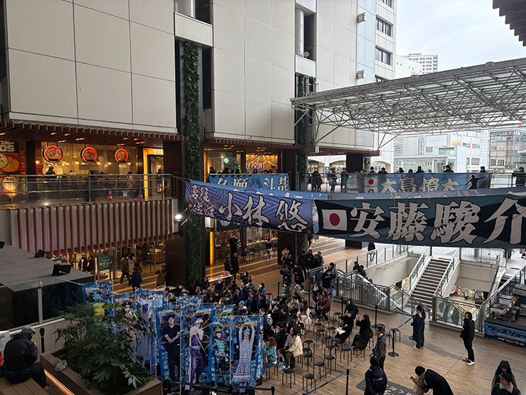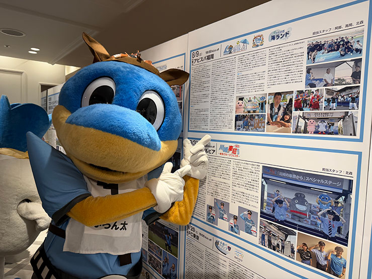 こちらは毎年サポーターの皆さまにご協力いただき、スタジアムさながらの雰囲気を演出しています。間近で見ると、トウヤの「斗」の一部がイルカになっていたり、サインが背景のイラストとしてあしらわれていたり... こだわりを感じますね!
