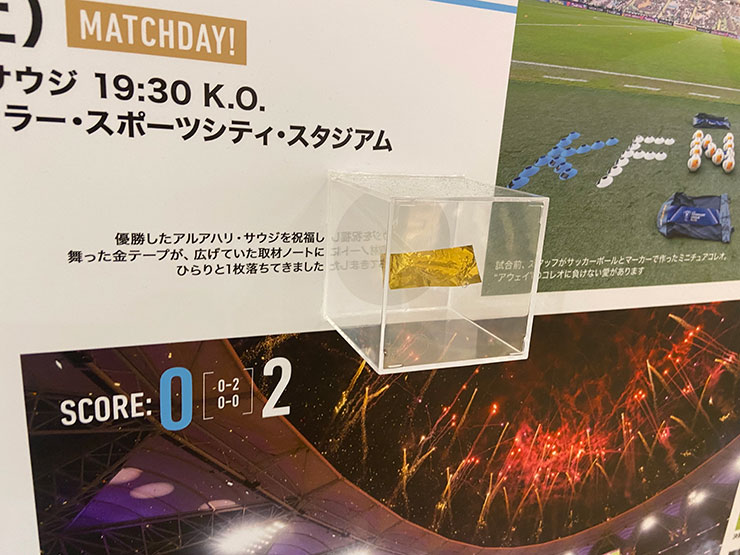 こちらはスタッフが「色んな角度から見てもらいたい! 透明な糸ってあるかな...!?」と展示方法に試行錯誤した、渾身の金テープ展示。