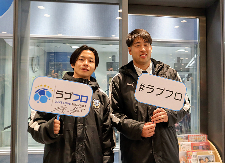 写真:商店街挨拶回りでかわさきFMに立ち寄ってくれた伊藤選手と早坂選手が、#ラブフロのパネルを持って撮ってくれました☆