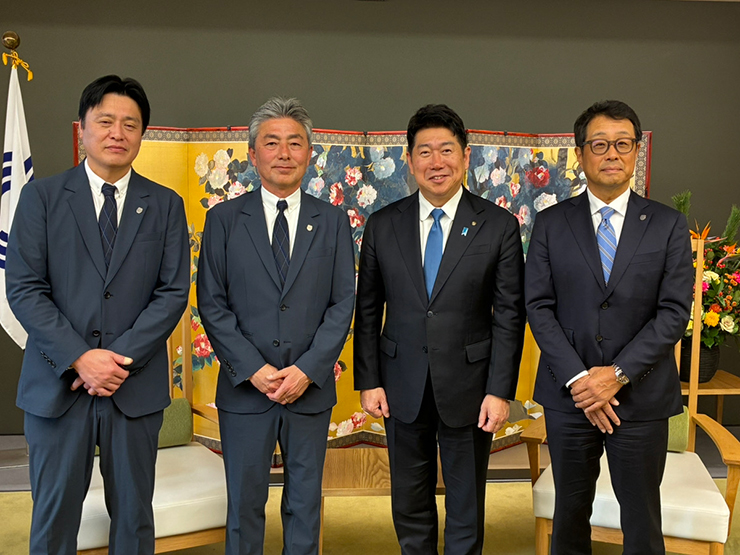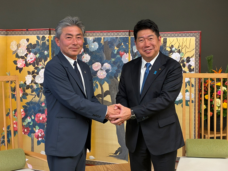 2026特別シーズンに向けてチームが始動した1月6日(火)、吉田明宏社長、竹内弘明強化本部長、長谷部茂利監督が、福田紀彦川崎市長へ年始のご挨拶に伺いました。例年は「音楽のまち・かわさき」とコラボしている新体制発表会見の場でご挨拶をしていましたが、シーズン移行に伴って今年は夏開催に変更となったこともあり、このタイミングで川崎市役所にお伺いすることになりました。長谷部監督になってからは初めての市長訪問ということもあり、一同、緊張しつつも、新シーズンへの熱い思いを胸に市役所を訪れました。
