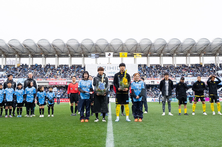 雪が降り続きとても気温も低く寒い中でしたが、最初に始球式リハーサルを行い、ピッチにはまだ雪も残る中リハーサルでも一発でゴールを決めていました!
