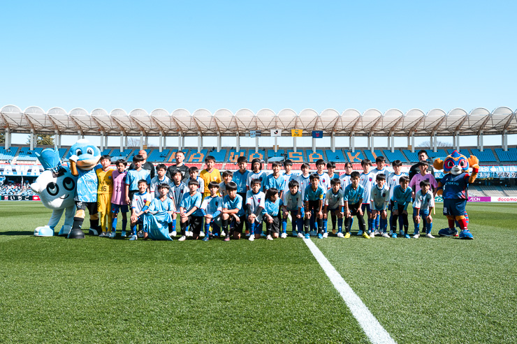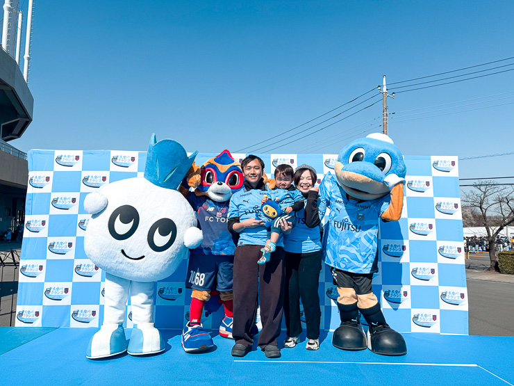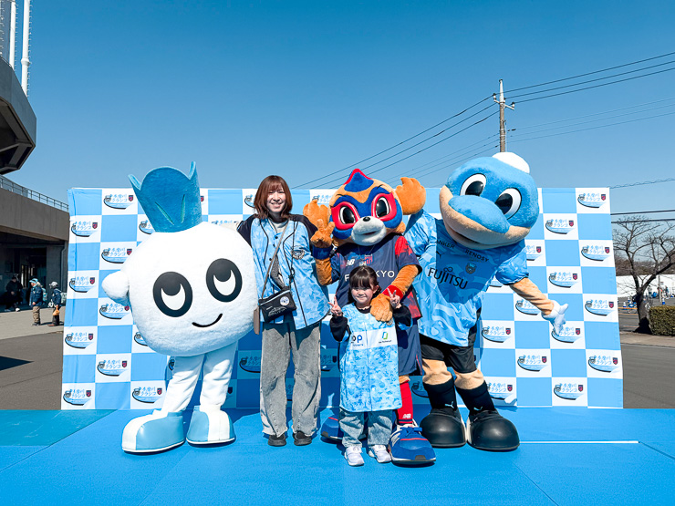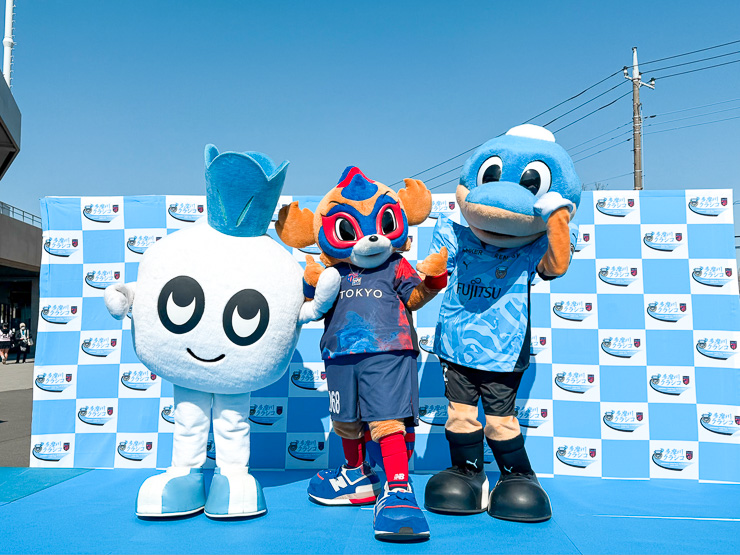 サポーターのみなさまとの撮影会後には、ドロンパからの提案で、ファインディングポーズでの撮影も。多摩川クラシコに向け、マスコットたちも気合十分でスタジアムへ向かっていきました。
