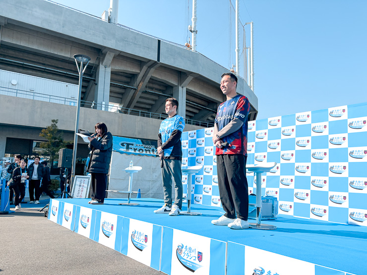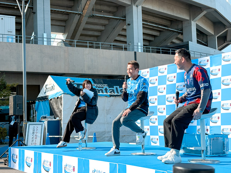 他にも、おふたりが現役だった時の多摩川クラシコについてなどもお話しくださいました。その中でおふたりとも言及されていたのが、「雰囲気の良さ」でした。この日もステージ前の観覧席では、両チームのサポーターが区切りなく観覧。海外ではなかなかないことだそう。試合は熱く、それ以外はあたたかくという雰囲気を一番の魅力として挙げられていました。