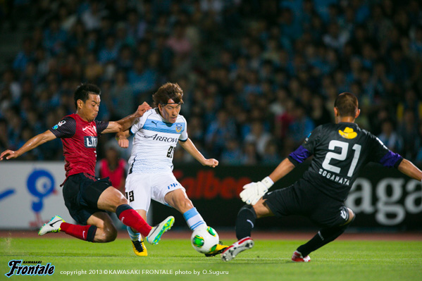 46分、フロンターレの攻撃。左サイドから崩しをかけるがラストパスにはつながらず。48分、鹿島の攻撃。左サイドから崩しをかけられ、前野の折り返しを受けた大迫に決定的なシュートを打たれるがGK杉山がキャッチ。ピンチをしのぐ。49分、フロンターレの攻撃。右サイドの中村からのボールを裏のスペースで受けた大久保がシュート性のボールを入れるが、ゴール前を通過。50分、左サイドから抜け出した山本が深い位置から折り返しを入れるが、惜しくもDFにクリアされる。迎えた51分、中村とのワンツーから抜け出したレナトが左サイド深い位置から折り返し。飛び込んだ大久保が合わせて4点目を奪う。(4-1) 52分、フロンターレの攻撃。自陣からボールをつないでカウンターを狙うが中村のロングパスは通らず。53分、左サイドからドリブル突破で抜け出したレナトがゴール前に迫るが、惜しくもシュートはゴール左に外れる。54分、鹿島の攻撃。右サイドからダヴィに突破を狙われるが、登里が体を張って対応。54分、フロンターレの攻撃。直後に反撃。レナトが左サイドからドリブル突破でボールを運びシュートを放つが、ゴール右に外れる。55分、鹿島の攻撃。左サイドのジュニーニョの突破は田中裕が対応。56分、さらに中央突破を狙われるがGK杉山が飛び出しキャッチ。61分、風間矢に代えて伊藤がピッチへ。伊藤が右サイドバック、田中裕が1列前のポジションへ。62分、鹿島の攻撃。遠藤のロングシュートは大きく外れる。64分、登里に代えて福森が入り、そのまま左サイドバックへ。65分、鹿島の攻撃。大迫へのロングボールは中澤が対応。68分、右サイドからのフリーキックの場面。遠藤のボールを大迫にヘッドで合わせられるが、GK杉山のファインセーブでしのぐ。
