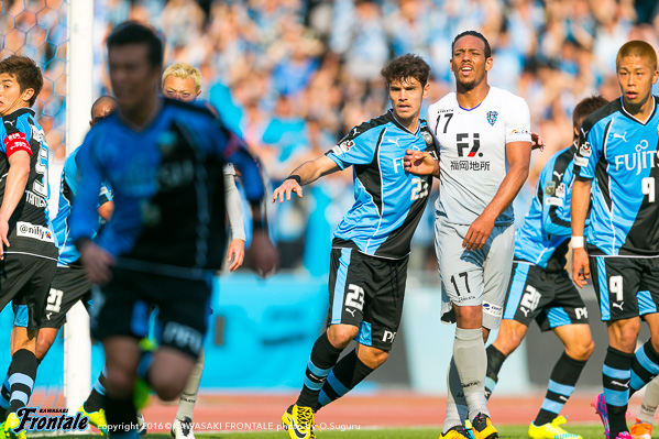 26分、ボールを回しながら押し込むが、ゴール前に入り込めず。29分、パスをつなぎ中央突破を狙うがDFにクリアされる。30分、福岡の攻撃。パスをつながれ末吉のスルーパスに抜け出した城後にシュートを打たれるが、GK新井が飛び出し体で止める。危ない場面だった。31分、左サイド に展開されるがエウシーニョが対応。32分、フロンターレの攻撃。中央で森本、田坂が粘りスルーパスを入れるが三好に合わず。34分、福岡の攻撃。右サイド裏のスペースを狙われるが、ウェリントンには車屋が対応。35分、左コーナーキックの場面。ショートコーナーから末吉にボールを入れられるが守備陣がクリア。36分、左サイド為田の突破は守備陣が対応。37分、フロンターレの攻撃。中盤でボールを奪い返し、ネットの縦パスを森本がはたき三好がシュートに持ち込むがGK正面。惜しい場面だった。39分、相手陣内でルーズボールを拾って押し込むがフィニッシュにつながらず。40分、福岡の攻撃。中盤でパスカットされカウンターを狙われるが守備陣が対応。41分、フロンターレの攻撃。直後に反撃。三好のドリブルからカウンターをしかけるが、ラストパスは惜しくも森本につながらず。43分、福岡の攻撃。中盤でカットされキム ヒョヌンにドリブルをしかけられ、右サイドからボールを入れられるがGK新井がキャッチ。危ない場面だった。45分、フロンターレの攻撃。福岡の攻勢をしのぎ速攻をかけ、三好が左サイドからシュートを狙うがブロックされる。アディショナルタイム1分。45+1分、福岡の攻撃。クリアボールを拾われ、左サイドから鈴木にアーリークロスを入れられるが守備陣がクリア。立ち上がりからフロンターレがパスをつなぎ崩しを狙うものの、福岡ディフェンスを崩し切れず。福岡のカウンターをしのぎながらチャンスを伺うがなかなか決定機を作れず、0-0のまま前半を折り返した。