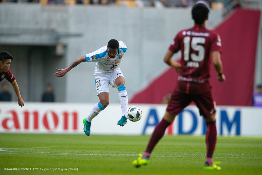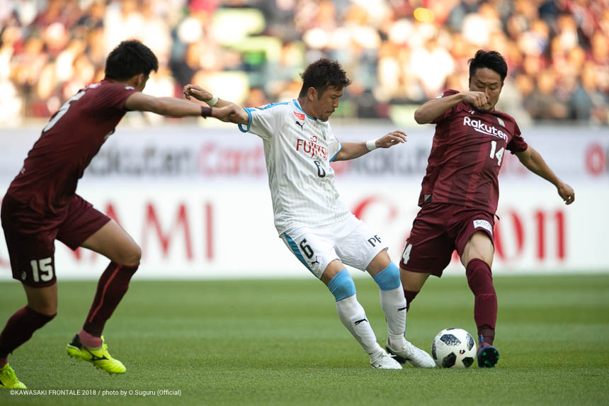 23分、パスを細かくつないで中央突破。ペナルティエリア前に迫るが、シュートに持ち込めず。25分、パスをつなぎネットの縦パスを中央の大久保が受けるが、ファールで止められる。26分、ペナルティエリア左前からのフリーキックの場面。家長が直接シュートを狙うが、GKにパンチングでしのがれる。クリアボールを拾い家長が右足で狙うが、シュートは大きく外れる。28分、神戸の攻撃。自陣からパスをつながれゴール前に押し込まれるが、守備陣がしのぐ。28分、自陣でネットが粘ってボールキープ。反撃をかけて大久保がミドルシュートに持ち込むが、うまくミートせず。29分、神戸の攻撃。右サイドから崩しを狙われるが、小川の突破は車屋が対応。30分、フロンターレの攻撃。左サイドに展開し大島が縦パスを入れるが、大久保にはタイミングが合わず。32分、中盤でパスカット。大久保が左サイドからサイドチェンジを狙うが、家長には合わず。33分、神戸の攻撃。右サイドから崩しをかけられポドルスキに戻され、佐々木にミドルシュートを打たれるが大きく外れる。34分、フロンターレの攻撃。中盤から阿部が背後のスペースを狙い、走り込んだ車屋が左サイドから速いボール。GKがはじくが誰も詰められず。惜しい場面だった。36分、神戸の攻撃。中盤でボールを回されるが、チームディフェンスでしのぐ。37分、中央から崩しを狙われチョン ウヨンに入り込まれるが、エウシーニョが体を入れて対応。39分、左サイドに展開され、ティーラトンにクロスを入れられるが奈良がクリア。40分、左サイドから崩しをかけられポドルスキにペナルティエリア内に入り込まれるが、守備陣がしのぐ。42分、フロンターレの攻撃。大久保の左サイドからの浮き球をゴール前で小林が競り合い、右サイドのエウシーニョが切れ込みゴール前で混戦となるがフィニッシュに持ち込めず。44分、右サイドから崩しをかけて大久保が戻すが、中央阿部に通らず。45分、神戸の攻撃。直後に反撃を受けて押し込まれティーラトンのクロスから混戦となるが、谷口がクリア。アディショナルタイム1分。45+1分、神戸の攻撃。右コーナーキックの場面。三田のボールは小林がクリア。セカンドボールを拾われ押し込まれるが、守備陣が耐える。立ち上がりにセットプレーの流れから谷口が押し込み、幸先良く先制。その後も何度かチャンスを迎えるが、追加点ならず。終盤は神戸の反撃を受けるが、粘り強く試合を進めて1-0で前半を折り返した。