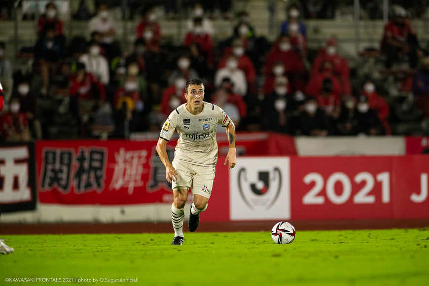 25分、飲水タイム。28分、浦和の攻撃。中盤でボールを奪われ縦パスを入れられ、右サイド関根の折り返しをファーサイド秋本に合わせられるがシュートはゴール上に外れる。30分、ジェジエウが負傷。時計が止まる。31分、ジェジエウに代わり山村がピッチへ。33分、浦和の攻撃。自陣からボールを運ばれ、右サイド関根にクロスを入れられるが車屋がクリア。34分、フロンターレの攻撃。攻勢をしのぎカウンターを狙うが、前線の家長には合わず。35分、浦和の攻撃。左サイドに展開され汰木に突破を狙われるが、脇坂とイサカで対応。しかし迎えた35分、自陣でボールを奪われ決定的なカウンターを浴び、左サイド江坂の折り返しを関根に合わせられ先制点を奪われる。(0-1) 37分、浦和の攻撃。左サイドに展開されクロスを入れられるが登里が対応。39分、攻勢をしのがれカウンターを狙われるが、守備陣が戻りながら対応。42分、フロンターレの攻撃。相手陣内でボールを奪いカウンターへ。ダミアンからラストパスを受けた家長がシュートに持ち込むが、惜しくもDFに当たり外れる。43分、右コーナーキックの場面。脇坂のボールからゴール前で混戦となり、ダミアンがシュートに持ち込むがゴール前でクリアされる。44分、シミッチが左サイドに展開。登里のななめのパスにイサカが飛び出し、角度のないところからシュートを放つが惜しくもGKに止められる。45分、浦和の攻撃。GKのロングキックからこぼれ球を拾われスルーパスを入れられるが、最終ラインで対応。アディショナルタイム2分。45+1分、浦和の攻撃。パスをつながれゴール前に縦パスを入れられるが守備陣がしのぐ。45+2分、左サイドからのフリーキックの場面。江坂のボールはダミアンがクリア。お互いに自陣からパスをつなぎ、前線からプレッシャーをかけてボール奪取を狙う展開が続く。しかしジェジエウが負傷。選手交代直後の一瞬の隙を突かれ、カウンターから失点。1点リードで前半を折り返した。