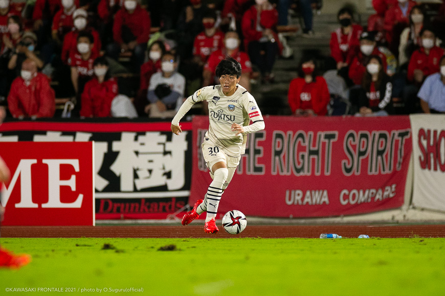 フロンターレのスターティングメンバーはトップにダミアン、左ワイドに遠野、右に家長、中盤前目に橘田と脇坂、底にシミッチ、最終ラインは登里-車屋-ジェジエウ-イサカ、GKソンリョン。2分、フロンターレの攻撃。中盤左サイドからのフリーキックの場面。脇坂のボールが入るが、合わせたジェジエウはオフサイドの判定。3分、浦和の攻撃。左サイド遠目から秋本にミドルシュートを打たれるが、守備陣がブロック。4分、セカンドボールを拾われ押し込まれるが、守備陣が対応。9分、フロンターレの攻撃。パスをつなぎ右サイド脇坂がゴール前にボールを入れるがクリアされる。12分、浦和の攻撃。中盤センターからのフリーキックの場面。小泉のボールはそのままラインを割る。13分、フロンターレの攻撃。左サイドに展開。遠野がクロスを入れるがゴール前に合わず。15分、左コーナーキックの場面。脇坂のボールはクリアされる。セカンドボールを拾い家長が右サイドから速いボールを入れるが、DFに当たりゴール前に合わず。左コーナーキックの場面。脇坂のボールはクリアされる。16分、連続左コーナーキックの場面。脇坂のボールはGKにパンチングでしのがれる。16分、フロンターレの攻撃。GKソンリョンのロングキックを登里がつなぎ、左サイド家長がクロスを入れるがダミアンには収まらず。17分、浦和の攻撃。中盤でルーズボールを拾われ左サイド汰木に突破を狙われるが、イサカが対応。18分、ショートカウンターを狙われるがジェジエウがカバーリング。20分、車屋の縦パスからつないで押し込み、シミッチがボールを入れるがゴール前に合わず。21分、浦和の攻撃。左サイド秋本に突破され、折り返しを入れられるがジェジエウがブロック。左コーナーキックの場面。江坂のボールはGKソンリョンがパンチング。セカンドボールを拾われ右サイドのショルツにクロスを入れられるが、シミッチがブロック。23分、フロンターレの攻撃。家長が左サイドに展開。登里がクロスを入れるがダミアンに合わず。25分、浦和の攻撃。自陣から長いボールを入れられるがオフサイドの判定。