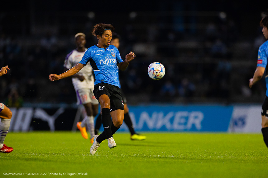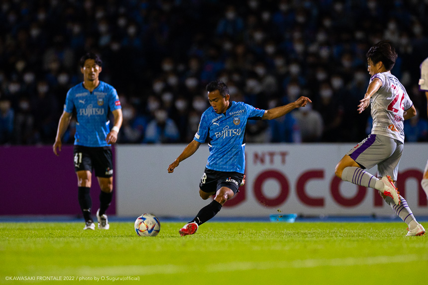 24分、京都の攻撃。ボールを奪い返され、右サイドから低いボールが入るが守備陣がクリア。25分、リスタートの流れ。右サイドに展開されクロスを狙われるが登里がブロック。26分、右コーナーキック。ショートコーナーから福岡にクロスを入れられるがGK丹野がキャッチ。27分、フロンターレの攻撃。自陣からボールを運び、カウンターからオーバーラップした谷口が左サイドからクロスを入れるがGKにキャッチされる。28分、京都の攻撃。攻勢をしのがれロングボールからカウンターを狙われるがGK丹野が飛び出して対応。29分、フロンターレの攻撃。ボールを奪い返し、中央突破から最後は小林がシュートに持ち込むがブロックされる。30分、さらに右サイドから崩しをかけ、山根が深い位置に入り込むが折り返しはGKに止められる。33分、京都の攻撃。中央からのフリーキックの流れ。ゴール前にボールが入り、圧力がかかる。ボールをエリア内に入れてきたが守備陣がクリア。35分、リスタートの流れからパスをつなぎ、左サイドに展開。マルシーニョの折り返しを小林がヘッドで合わせるがGKにキャッチされる。37分、中盤で登里がボールを奪い返し、粘ったマルシーニョが戻したボールを脇坂がシュートに持ち込むがゴール右に外れる。38分、ゴール前の相手のパスミスに詰めた家長がダイレクトでシュートに持ち込むがゴール上に外れる。39分、相手陣内でボールを奪い返し、チャナティップがサイドチェンジ。右サイドの家長を起点に攻勢をかけ最後は登里がシュートに持ち込むがうまくミートせず。40分、中盤でプレッシャーをかけてボールを奪い返し左サイドからマルシーニョが切れ込みシュートを放つがGKにキャッチされる。43分、京都の攻撃。中盤でボールを奪い返され、右サイドから崩しをかけられクロスが入るが守備陣がしのぐ。44分、右コーナーキック。松田のボールからゴール前で混戦となるが登里が落ち着いて対応。難を逃れる。45+2分、左サイドからのフリーキック。荻原のボールは橘田がクリア。セカンドボールを拾われるがチームディフェンスでしのぐ。立ち上がりからボールを保持して厚みのある攻撃をしかけ、守備では強度の高いプレッシングからボール奪取。攻守においてアグレッシブな姿勢を出したフロンターレが2点を先取し、2-0で前半を折り返した。