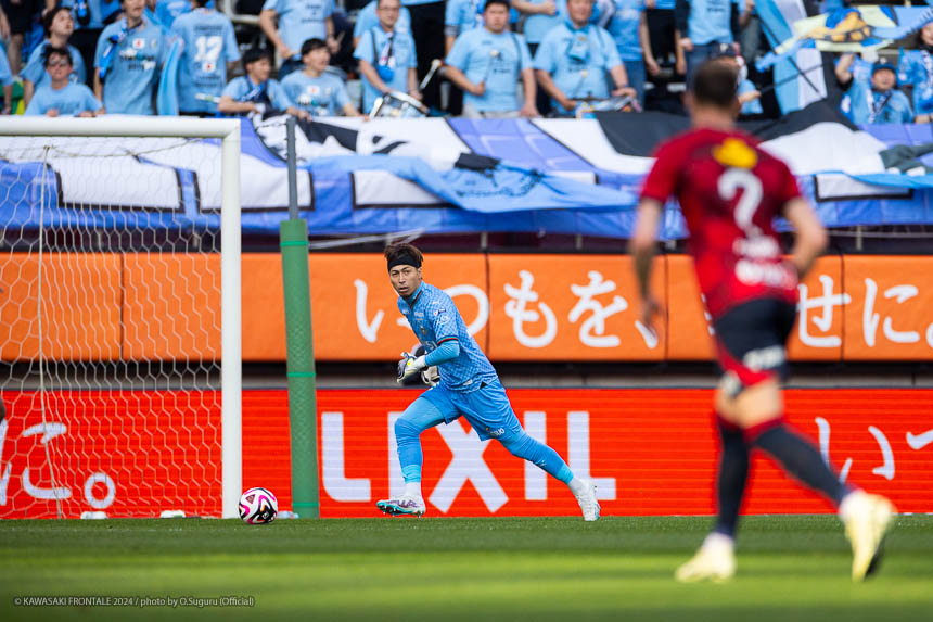 24分、鹿島の攻撃。中盤でインターセプトされカウンターを浴び、左サイドから安西にクロスを入れられるがボールはゴール前を通過。26分、フロンターレの攻撃。相手陣内でパスをつないで押し込み、ジェジエウがスルーパスを狙うがうまく合わず。27分、鹿島の攻撃。右サイドから崩しをかけられ、さらにセカンドボールを拾われ圧力をかけられるが左サイドの安西には橘田が対応。29分、フロンターレの攻撃。細かくパスをつないで相手陣内に押し込み、最後は瀬古が左サイドからミドルシュートを放つがDFに当たりGKにキャッチされる。30分、中盤左サイドからのフリーキックの場面。三浦がボールを入れるがクリアされる。セカンドボールを拾って三浦が中盤左サイドから長いボールを入れるがGKにキャッチされる。32分、中盤やや左サイドからのフリーキックの場面。山本がボールを入れるがGKパンチング。セカンドボールを拾いジェジエウからボールを受けたマルシーニョがターン。シュートに持ち込むがうまくミートせず。33分、鹿島の攻撃。左サイドに展開され安西にアーリークロスを入れられるが、ボールはゴール前を通過。迎えた36分、フロンターレの攻撃。自陣から鹿島のプレッシャーをかわしてボールを運び、右タッチライン際でボールを受けた脇坂が相手DFライン裏のスペースにボールを入れ、走り込んだ家長がシュート。GKがはじいたボールに走り込んだマルシーニョが落ち着いてシュートを決めて先制点を奪う。(1-0)39分、鹿島の攻撃。中盤でボールを奪われショートカウンターを浴び、右サイドに流れた名古に浮き球を入れられるが鈴木には合わず。41分、フロンターレの攻撃。中盤でボールを動かし左サイドから三浦が背後のスペースにボールを入れるがGKにキャッチされる。41分、鹿島の攻撃。中盤右サイドからの濃野のアーリークロスを名古にヘッドで合わせられるがゴール上に外れる。危ない場面だった。43分、フロンターレの攻撃。中盤左サイドからのフリーキックの場面。三浦のボールはクリアされる。セカンドボールを拾い山田が左サイドから浮き球を入れるがオフサイドの判定。45分、右スローインの流れ。ペナルティエリア内で山田が粘り、こぼれ球に脇坂が詰めるがシュートはゴール左に外れる。惜しい場面だった。アディショナルタイム2分。立ち上がりからいい形でゴール前にボールを運べず、逆に鹿島のカウンターを浴びる展開が続く。しかし我慢強く試合を運び、マルシーニョのゴールで先制。ワンチャンスをものにして1点リードで前半を折り返した。