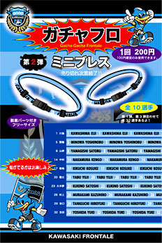 ピンズに次ぐガチャフロアイテムとして販売しているミニピンズ。第一弾に続き、第二弾がいよいよ販売スタート。今回は、川島・山岸・中村・菊地・養父・久木野・村上・谷口・吉田の9選手。人気選手が多いので、ぜひお気に入りの選手のミニブレスは速めにゲットしよう。1回200円ですので、ぜひチャレンジしてみては。