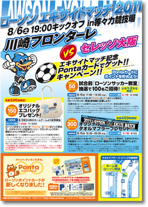 川崎フロンターレオフィシャルスポンサー「ローソン」では、8月6日(土)に開催されるローソンエキサイトマッチ 川崎フロンターレvsセレッソ大阪戦を記念して、ローソンが発行するポイントカード「Pontaカード」のポイントで下記試合前ローソンサッカー教室への参加者募集、オリジナルタオルマフラーやオリジナルエコバッグのプレゼントを実施する「Pontaカードでゲット!キャンペーン」を開催しますので、お知らせします。