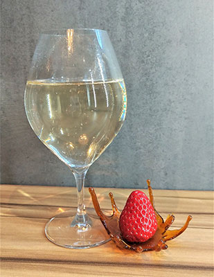 スパークリングワインと、キャラメルであしらった、王冠(クラウン)にいちごを添えて提供する一品。キャラメルはそのまま召し上がれます!