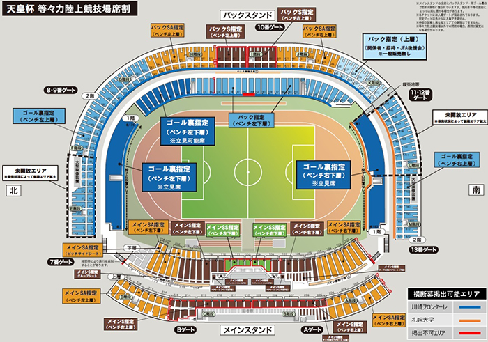 バック指定(ベンチ左下層・上層)とゴール裏指定(ベンチ右下層・右上層)を境目(左側:川崎フロンターレ、右側:札幌大学)に区切り運用いたします。