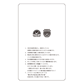 昭和11年創業の『ツバメノート株式会社』とのコラボが実現いたしました。ツバメノートをもじって...。ツバ“メーカブー”ノートとして販売いたします! 紙は筆記用として最高級の品質で書きやすく、にじまず、ツルツルしすぎず、ざらざらもしていない。というツバメ中性紙フールスを使用しています。また色も蛍光染料を一切使っておらず、目が疲れない仕様になっています。