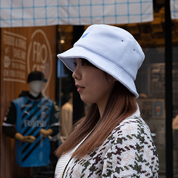 柔らかい触り心地の良い生地感のバケットハットは生地に淡い水色を採用し、ふろん太のシルエットを同系色で刺繍加工しています。冬の時期に活躍するグッズです!