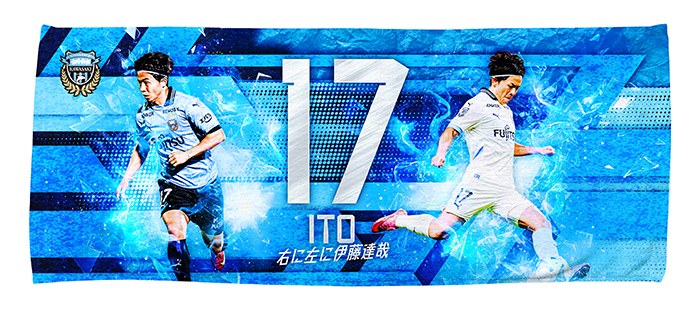 右サイド、左サイドに渡り、縦横無尽に駆け上がり得点を決めている伊藤達哉選手のプレー写真を、「右に左に」デザインしたフェイスタオルです。