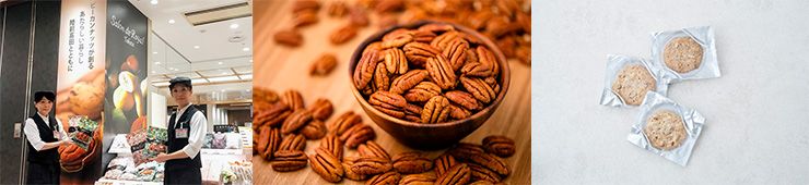 ビタミンやミネラルやオレイン酸を含んだ栄養豊富なピーカンナッツ。2022年7月に陸前高田にオープンしたピーカンナッツ産業振興施設のナッツ工場で加工したナッツ商品も取りそろえています。