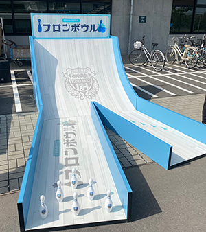 | ルール | ・1人2球チャレンジ。 ・湾曲した壁にボールを蹴り、壁のボールを転がして反対側のピンを倒そう! 結果に応じて景品をプレゼント! |