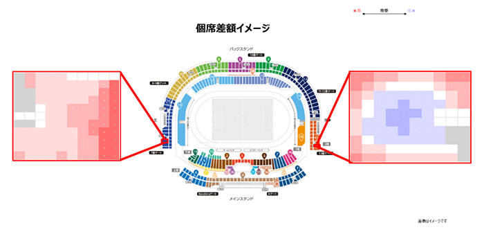 「個席差額設定値」は、ダイナミックプライシングを導入してからの全試合の席位置ごとの販売動向をデータ分析のうえ、「需要の高い座席」と「比較的販売スピードが緩やかな座席」との違いを定量的に把握し、ダイナミックプラス株式会社と共同で算出した価格差設定に用いるものです。