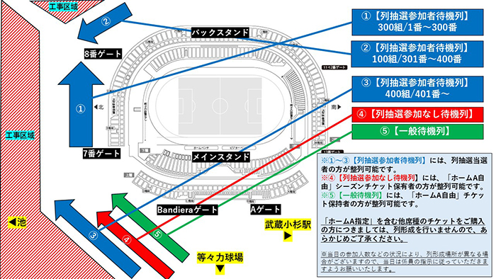 試合日の早朝より、会場での列形成について多くのご意見をいただいておりますが、等々力緑地再編整備工事に伴い、入場ゲート付近には十分な待機スペースがなく、事前に列形成を行わなかった場合、開門前後に混乱が生じる恐れがあります。スタジアムにご来場のすべての皆さまの安全確保のため、事前の列形成を実施しています。ご理解のほど、よろしくお願いいたします。