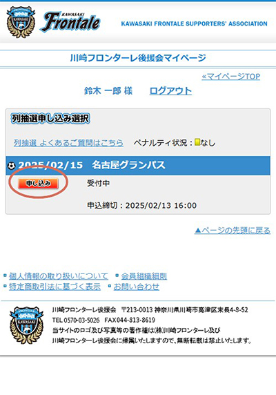 3. 列抽選に参加する試合を選択し、お申し込みください