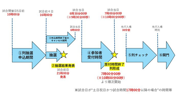 ・試合当日の朝7:00より7番ゲート前に列形成を開始いたします。当日は係員の指示に従っていただきますようお願いいたします。