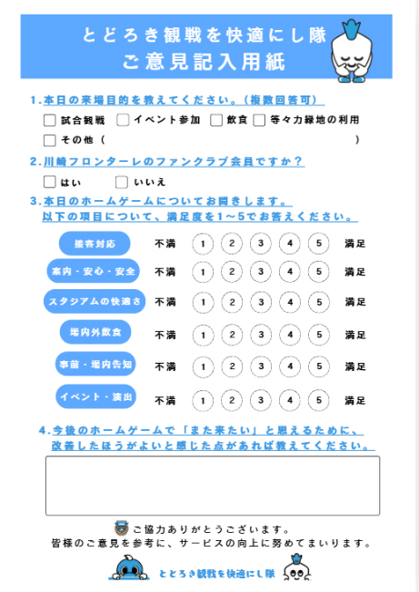 川崎フロンターレでは、ホームゲーム開催日に「とどろき観戦を快適にし隊 ご意見箱」を設置いたしますので、お知らせいたします。