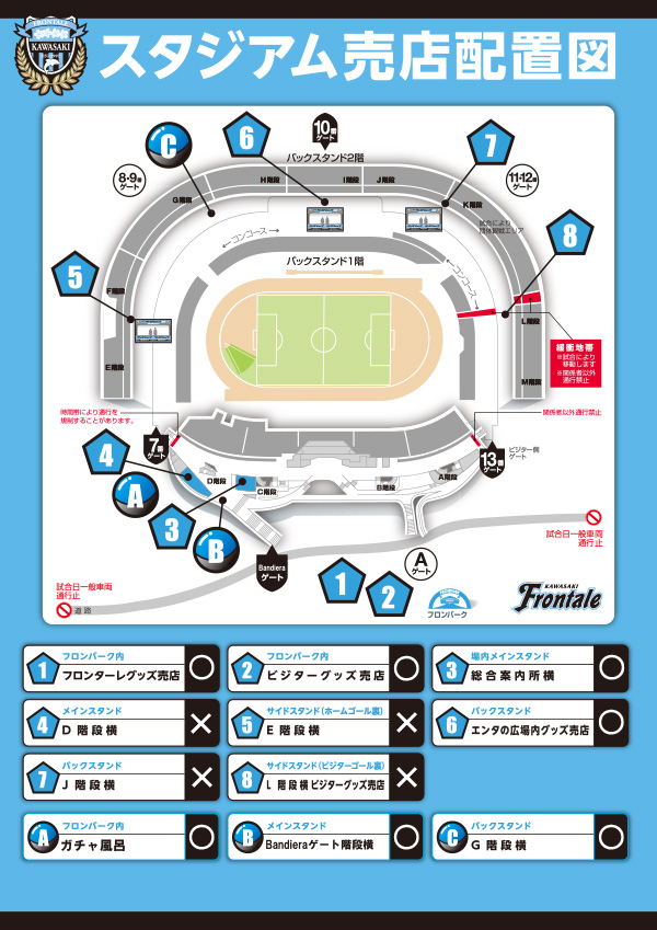 ◇入場について席種ごとに入場ゲートが指定されていますので、券面に記載の入場ゲートよりご入場ください。 ・キックオフ直前は多くの方が入場するため、通信負荷がかかり、入場に時間がかかる場合がございます。 ・シーズンチケットをお持ちの方の入場方法はこちらをご確認ください。 ・再入場について スタジアム内で撮影された全映像(静止画を含む)は、報道等を目的とした各種番組や各種の物販・販促等に使用される場合があります。 |