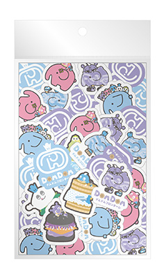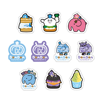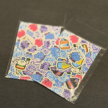 「ゾウさん増産!?」という発想をそのまま商品化したフレークシールで、フロンターレカラーに染まったドムぞうくんと架空メニューをデザインに落とし込みました。耳が「フ」、しっぽが「ロ」になるなどの遊び心も。