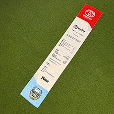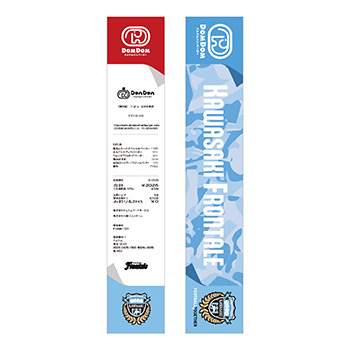 存在しないはずの店舗という違和感をそのまま形にしたリバーシブル仕様のタオルマフラーで、表面はスタジアムで使用できるフロンターレ仕様のデザインでありながら、裏面には“幻の川崎店”のレシートを大胆に落とし込み、並ぶメニューは見覚えのあるようでない内容に。一つひとつの品目を追うごとに違和感が広がっていく構成で、応援アイテムでありながら読み込む楽しさも味わえます。