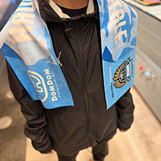 ホームゲーム勝利時限定で発売する限定デザインのタオルマフラー。青のラメ糸や星形のワッペンを使用した、勝利時限定の特別デザインです!