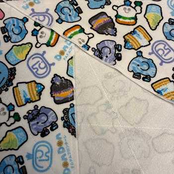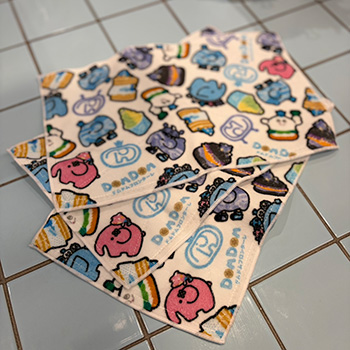 “象”というモチーフをまさかのかたちで落とし込んだアイテム。実用性を備えつつ、全面に展開されたマスコットと架空メニューの総柄デザインによって、使用するかどうかを少し迷わせる仕上がりとなりました。