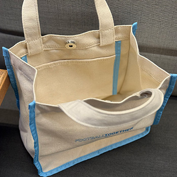 内ポケット付きで小さな荷物も分けて入れることができるので使い勝手が良いです。フックには推し選手のキーホルダーを付けてあなただけのトートバッグを作りましょう!!