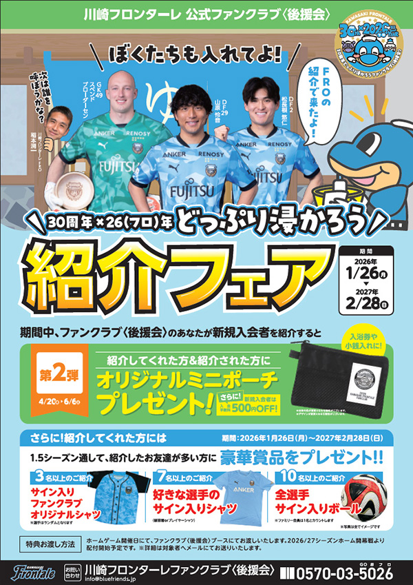ファンクラブ〈後援会〉では、クラブ創設30周年という大きな節目。フロンターレとして大切な数字の「26(フロ)年」でもあります。