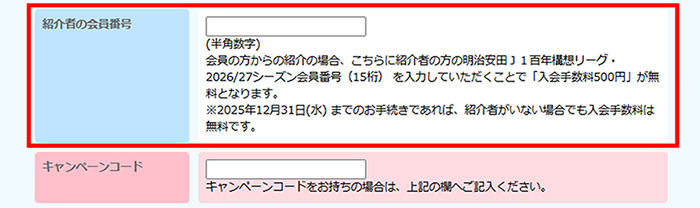 ご入会の際に、入会ページの「紹介者の会員番号」欄に紹介者の会員番号をご入力ください。