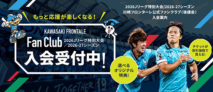 明治安田J1百年構想リーグ・2026/27シーズン川崎フロンターレファンクラブ〈後援会〉入会の詳細は、こちらからご確認ください。